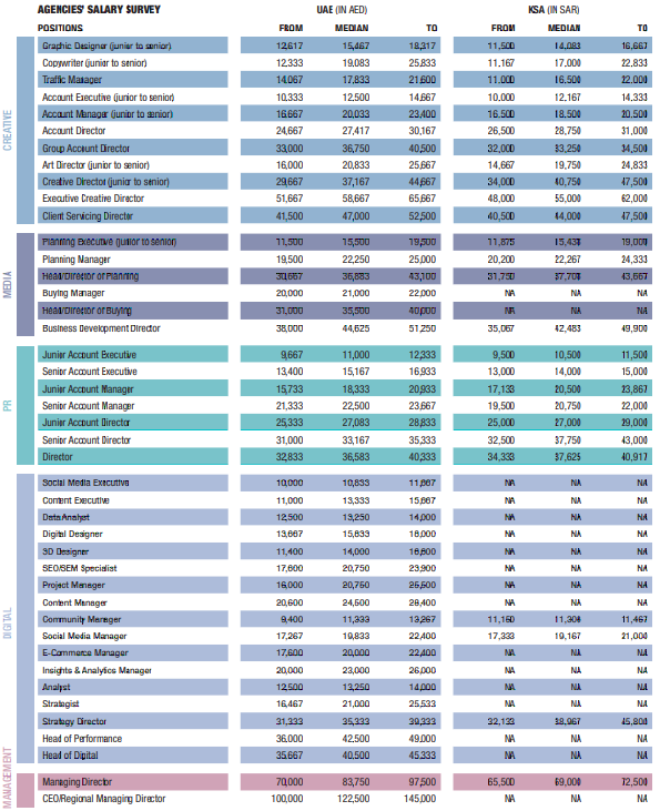 Firstly, we asked agencies to share the salary package they offer, including allowances and benefits, along with a number of other details that delineate the shape of their workforce. More than 30 organizations, including multinational networks and independent groups or agencies operating in the GCC, took part in this initiative (this number includes the individual agencies under the networks that answered and are, indeed, covered by the survey).