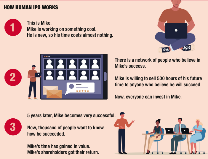 • Human IPO allows anyone to buy and sell someone’s time, one hour at a time, as if you’re buying a stock in a company. As the person gets more important, his/her time becomes more valuable, generating a return on a fan’s original investment. You can buy shares in Valentine, a data scientist, or Deborah, an MBA candidate at UCLA, hoping that as they become successful, their time value increases.